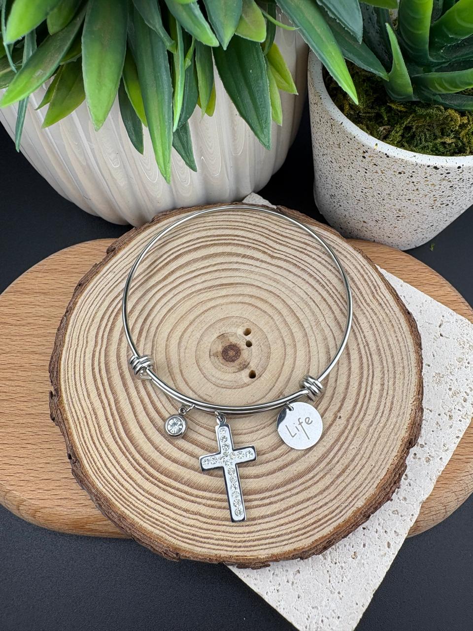 Stainless Steel Silver Cross & Charm Bracelet #2
